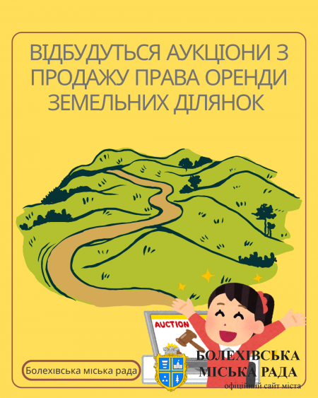Болехівська міська рада повідомляє, що відбудуться аукціони щодо продажу права оренди земельних ділянок. У аукціонах можуть взяти участь всі охочі (громадяни України, фізичні особи — підприємці, юридичні особи України та іноземні юридичні особи,...