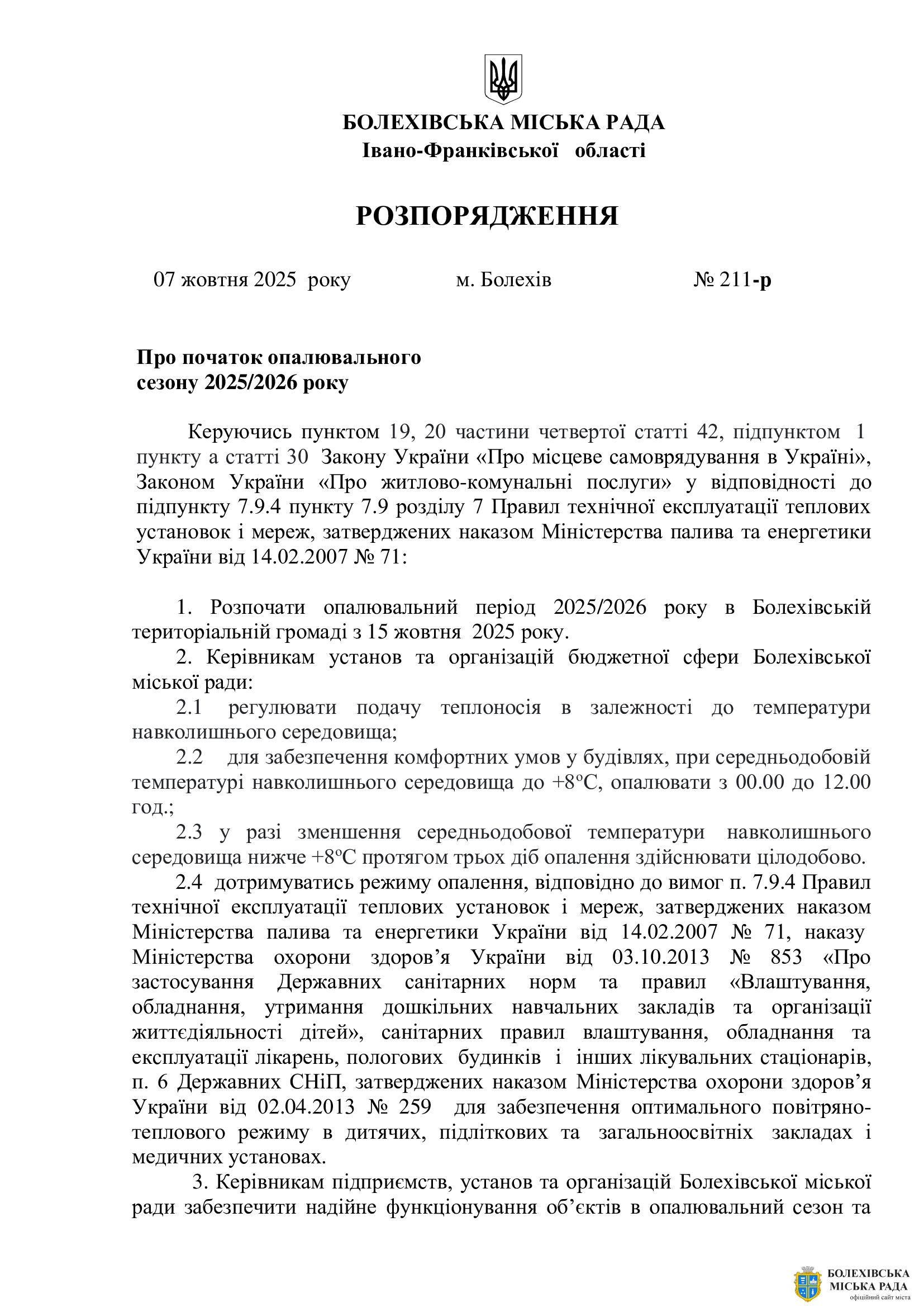 Відповідне розпорядження від 7 жовтня 2025 року №211-р підписав міський голова Іван Яцинин.