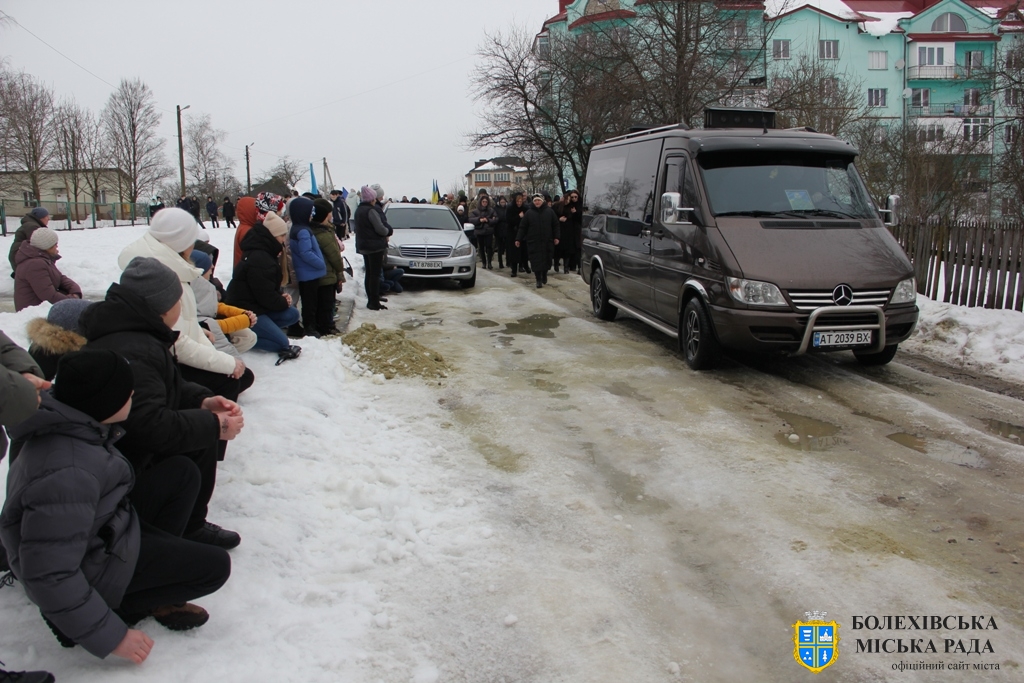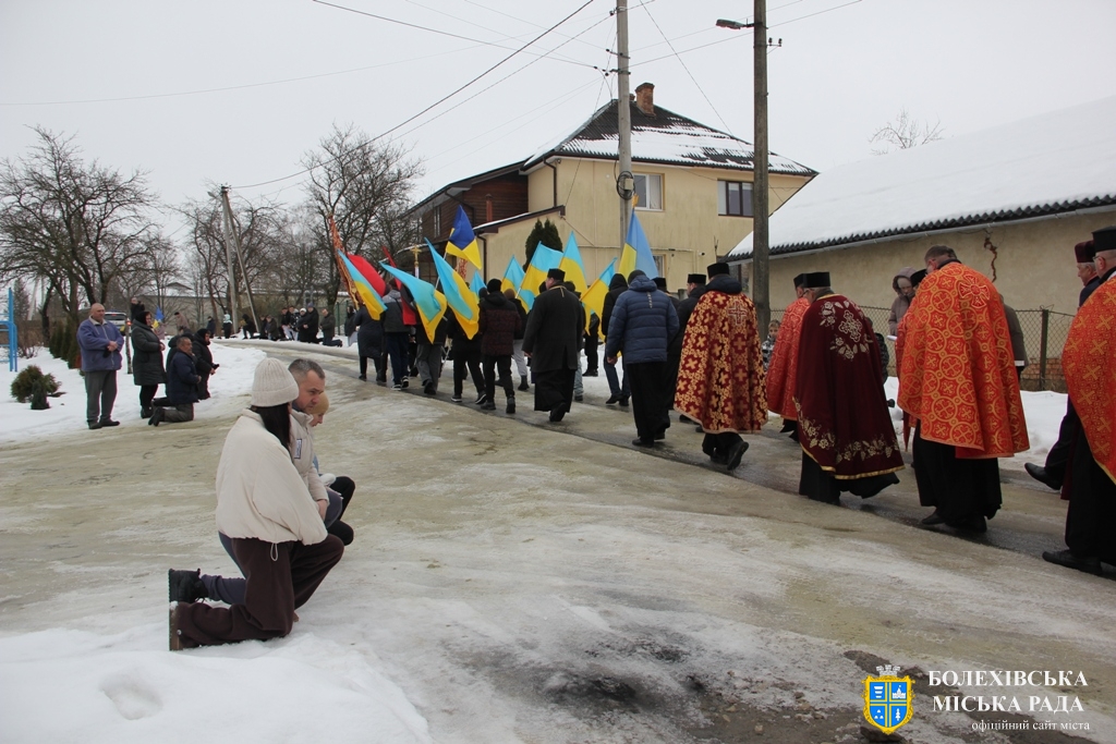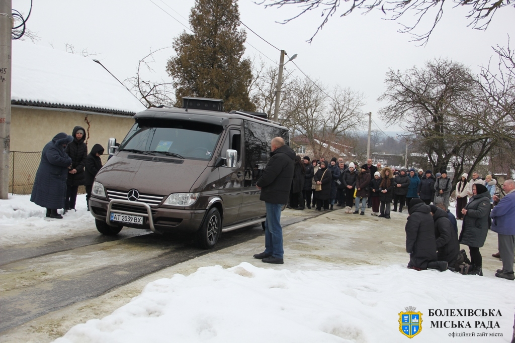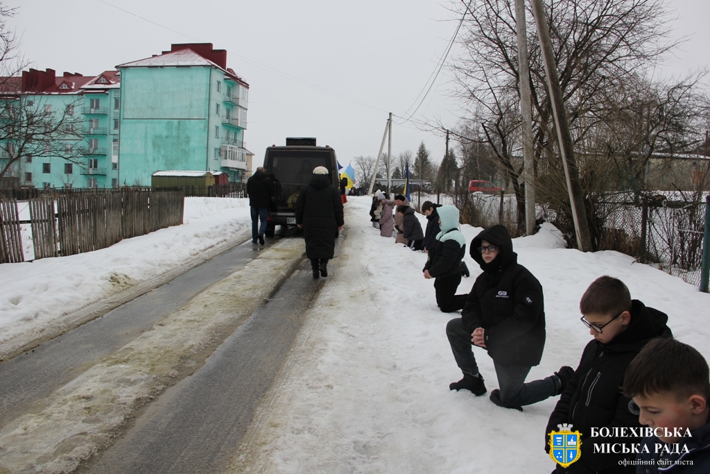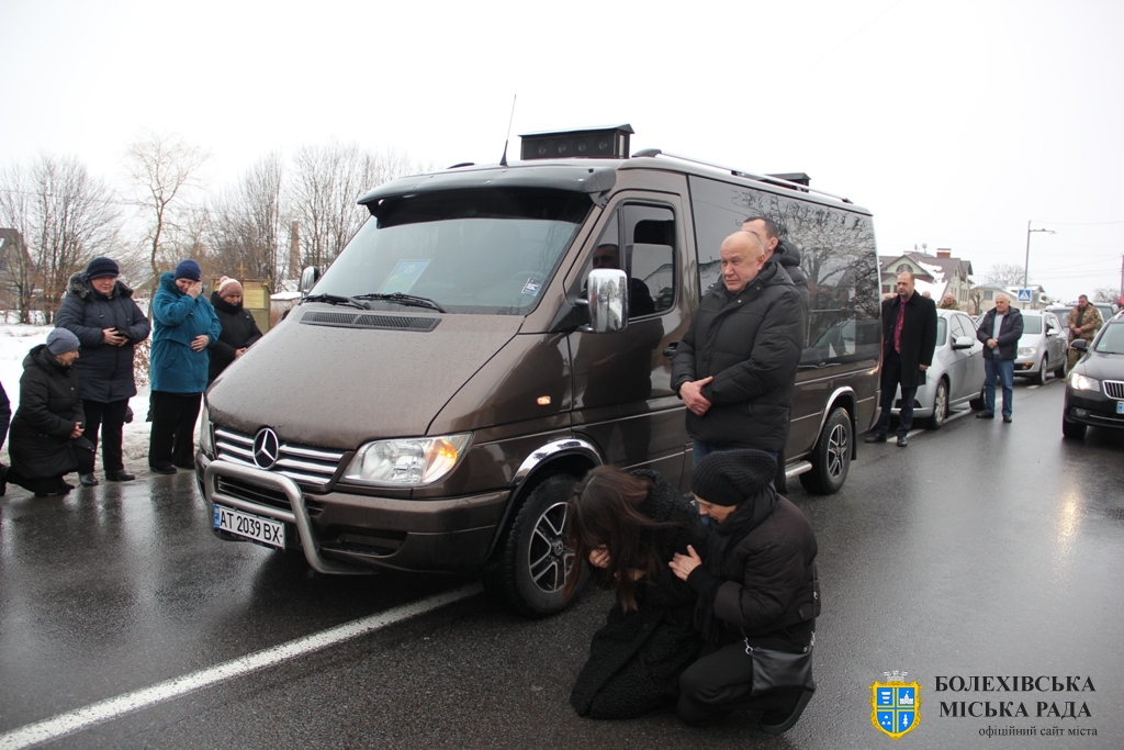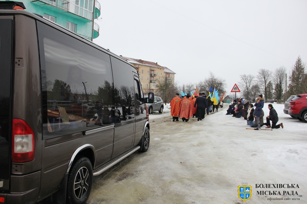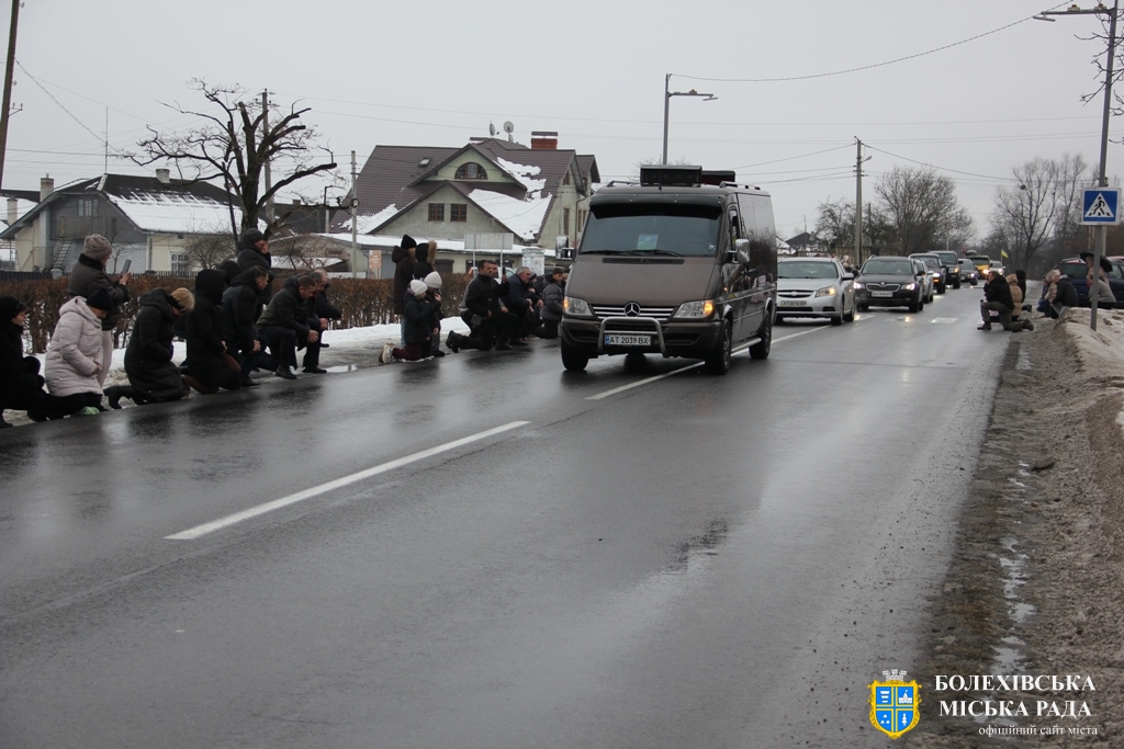 Близько обідньої пори траурний кортеж прибув до Болехова. Із сльозами на очах та відчуттям невимовної втрати, стоячи на колінах, жителі громади зустріли полеглого Героя біля храму святих верховних апостолів Петра і Павла.
