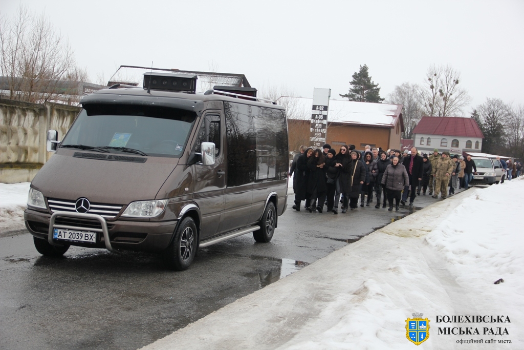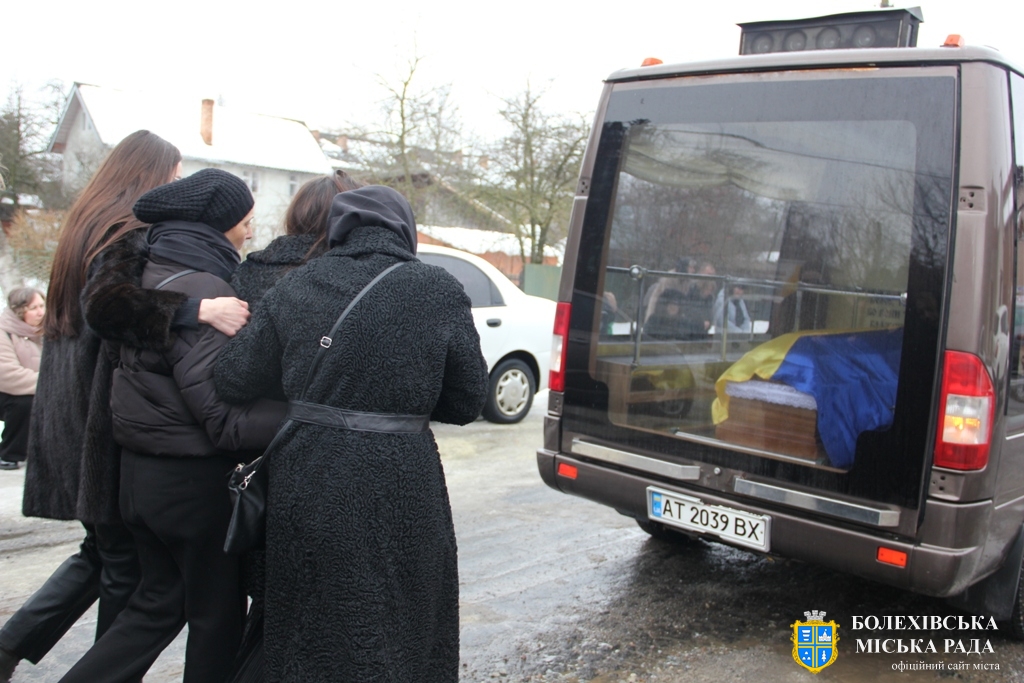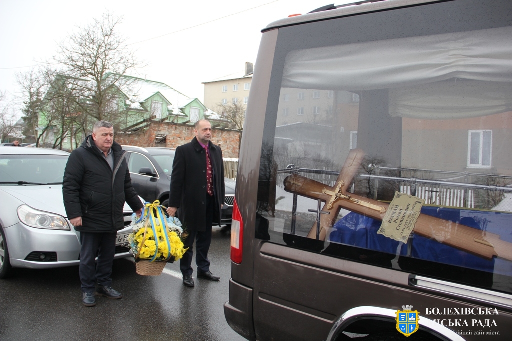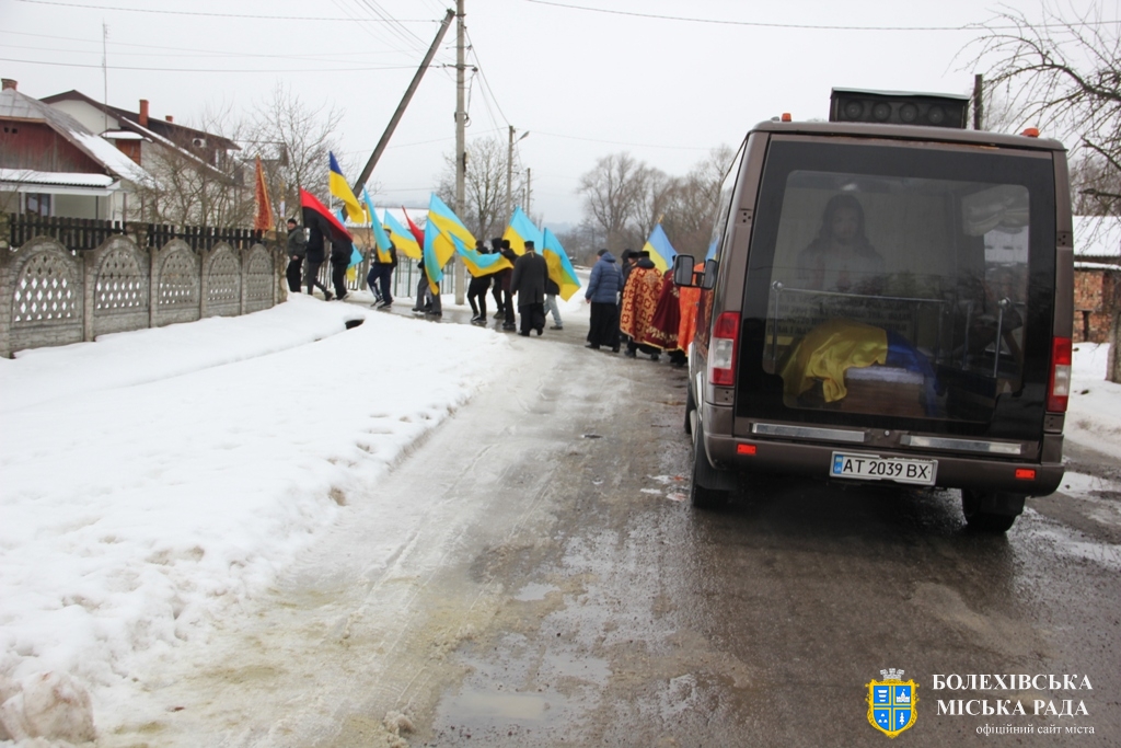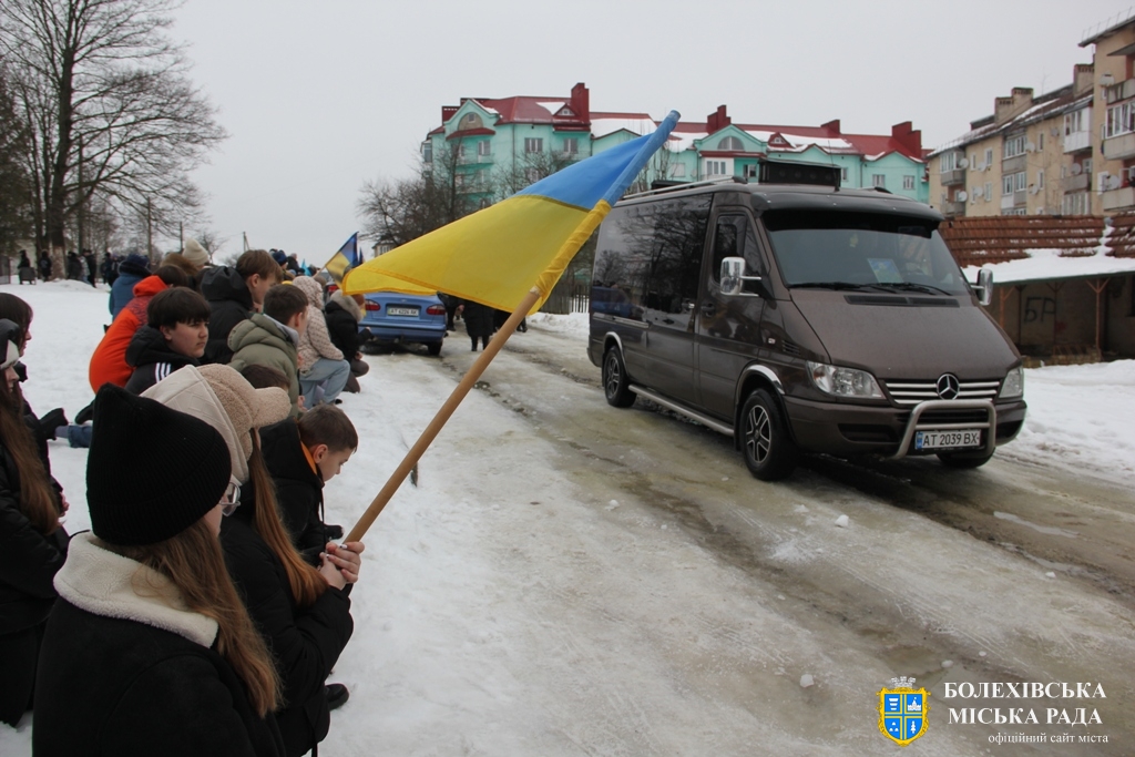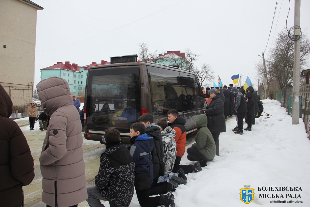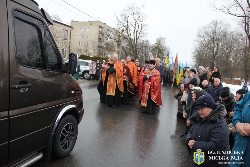 Близько обідньої пори траурний кортеж прибув до Болехова. Із сльозами на очах та відчуттям невимовної втрати, стоячи на колінах, жителі громади зустріли полеглого Героя біля храму святих верховних апостолів Петра і Павла.