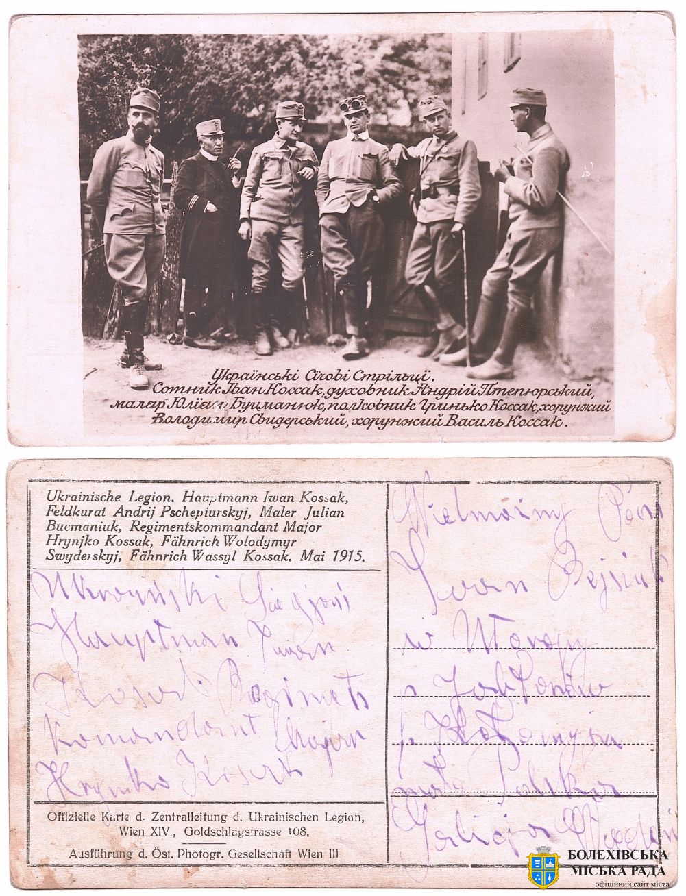 2 | Українські Січові Стрільці: сотник Іван Коссак, духовник Андрій Пшепюрський, маляр Юліян Буцманюк, полковник Гриць Коссак, хорунжий Володимир Свидерський, хорунжий Василь Коссак Травень 1915 року. Джерело: Леґіон Українських Січових Стрільців. Фотоархів Приватна колекція ГТМ Файл Г.Т.М_014.jpg |
