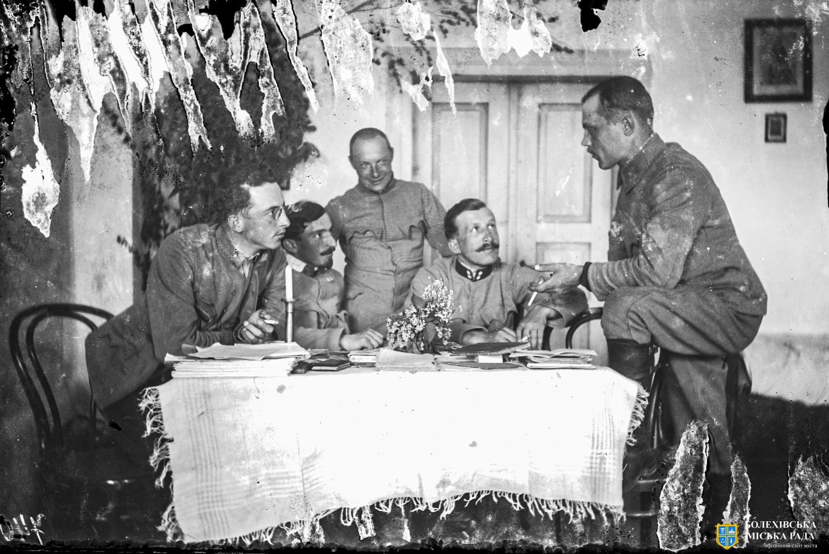 3 | В Болехові на квартирі. Зліва: хорунжий Петро Дідушок, сотник Василь Дідушок, як заступник атамана, сотник д-р 0. Левицький, сотник Осип Будзиновський, сотник Дмитро Вітовський. Червень 1915 року. Джерело: Леґіон Українських Січових Стрільців. Фотоархів Архів: Український Музей і Бібліотека у Стемфорді (Канада); Фонд Українські Січові Стрільці. Файл UML_Box_60-00624 Опис взято з: Українські Січові Стрільці в Карпатах. Наші стрільці в рік по Шевченківськім здвизі, 28 червня 1914 року. Бібліотека Української боєвої управи, ч. 1. Упорядник Іван Боберський. Відень, 28 червня 1915 року. С. 20. file:///C:/Users/%D0%9C%D0%B0%D1%80%D1%82%D0%B0/Desktop/file.pdf |