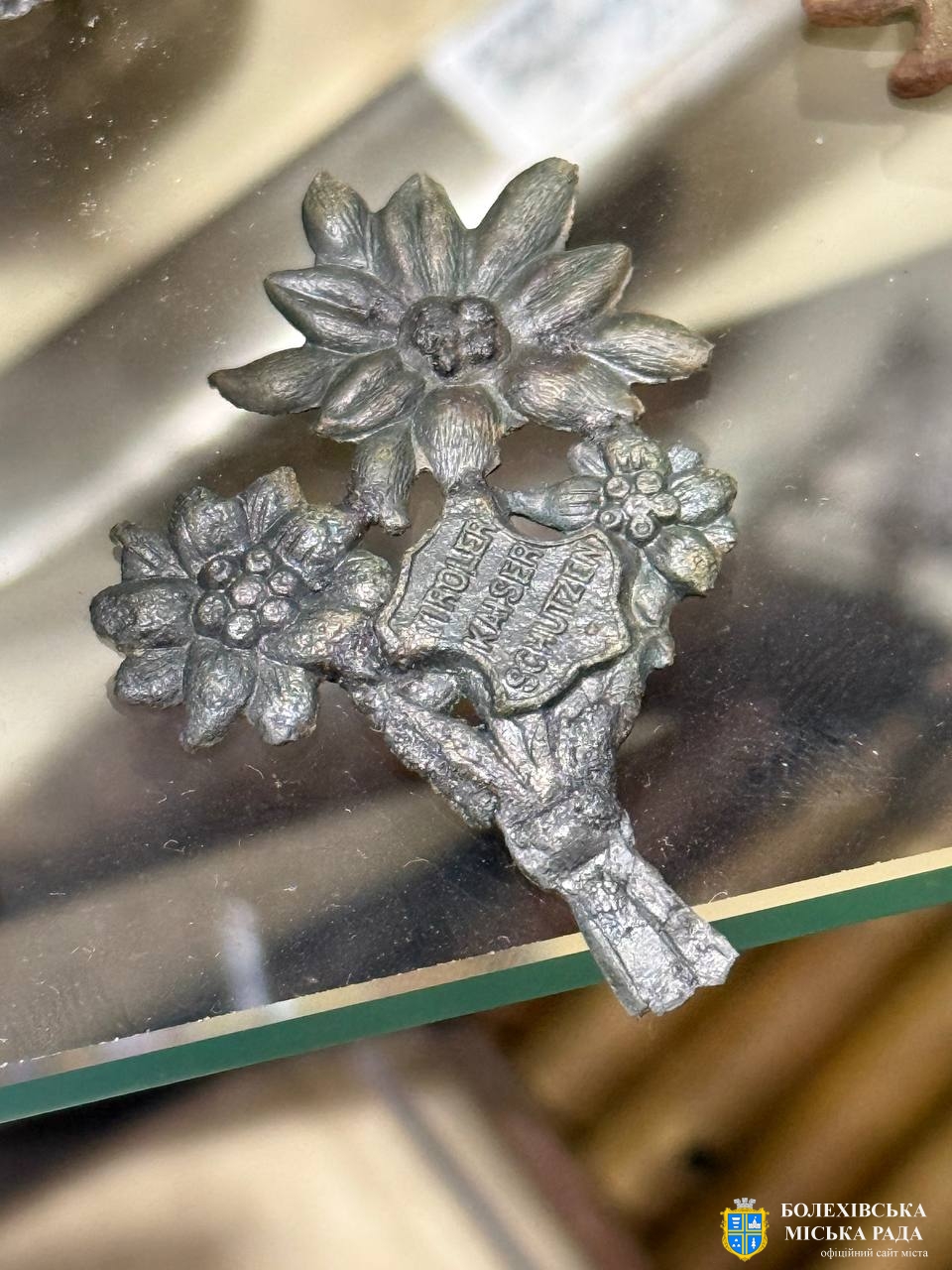 31 | Кокарда тірольських кайзерівських стрільців «Едельвейс». Джерело: Краєзнавчий музей «Патріот», с. Тисів Болехівської міської територіальної громади Калуського р-ну Івано-Франківської області. Кн–459, А–395. Знайдено в урочищі Лани, с. Тисів). |