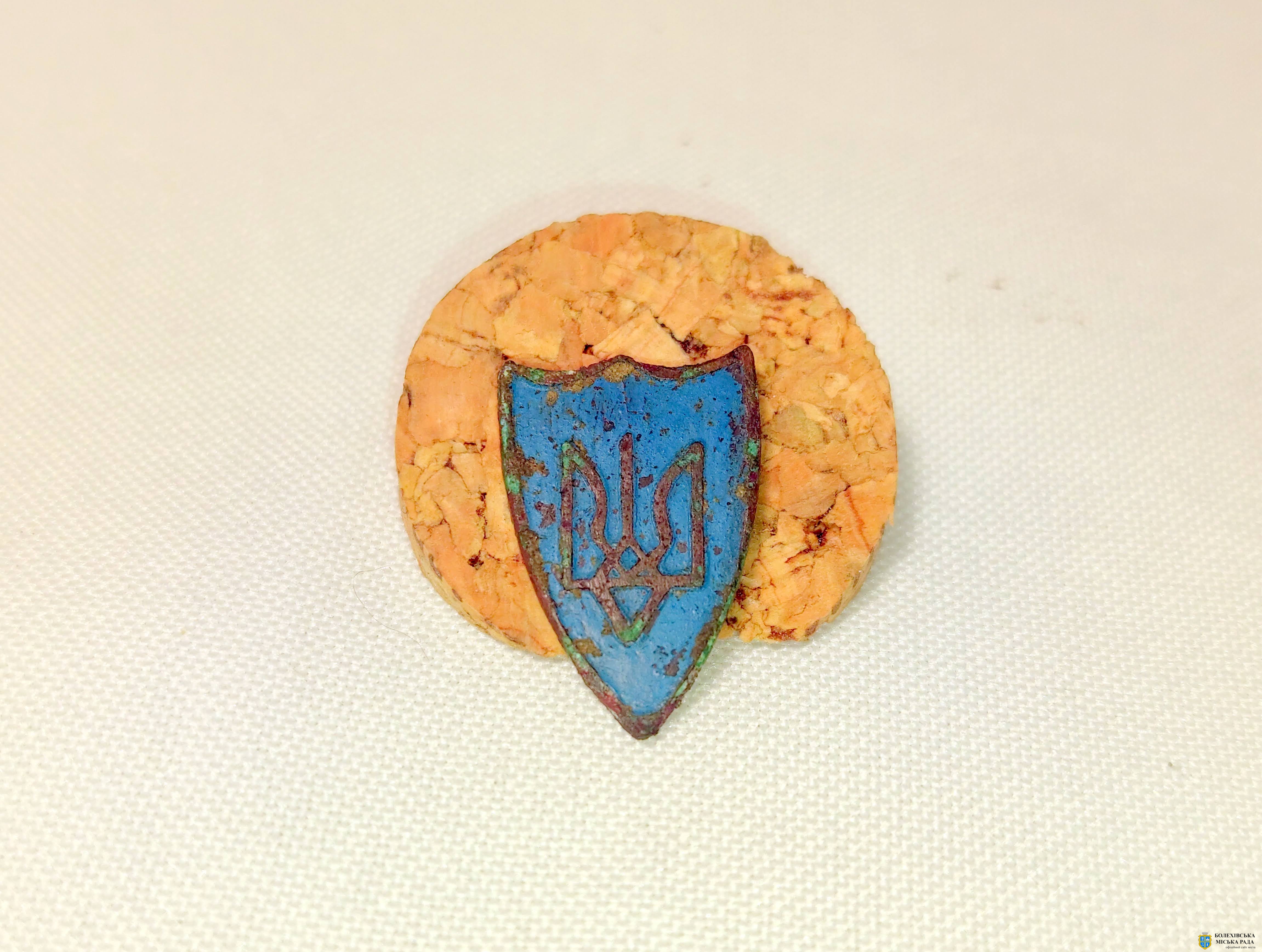 30 | Знак «Тризуб» в емалі часів УСС. Джерело: Краєзнавчий музей «Патріот», с. Тисів Болехівської міської територіальної громади Калуського р-ну Івано-Франківської області. Кн–150, А–150. Знайдено на Болехівській горі, м. Болехів). |
