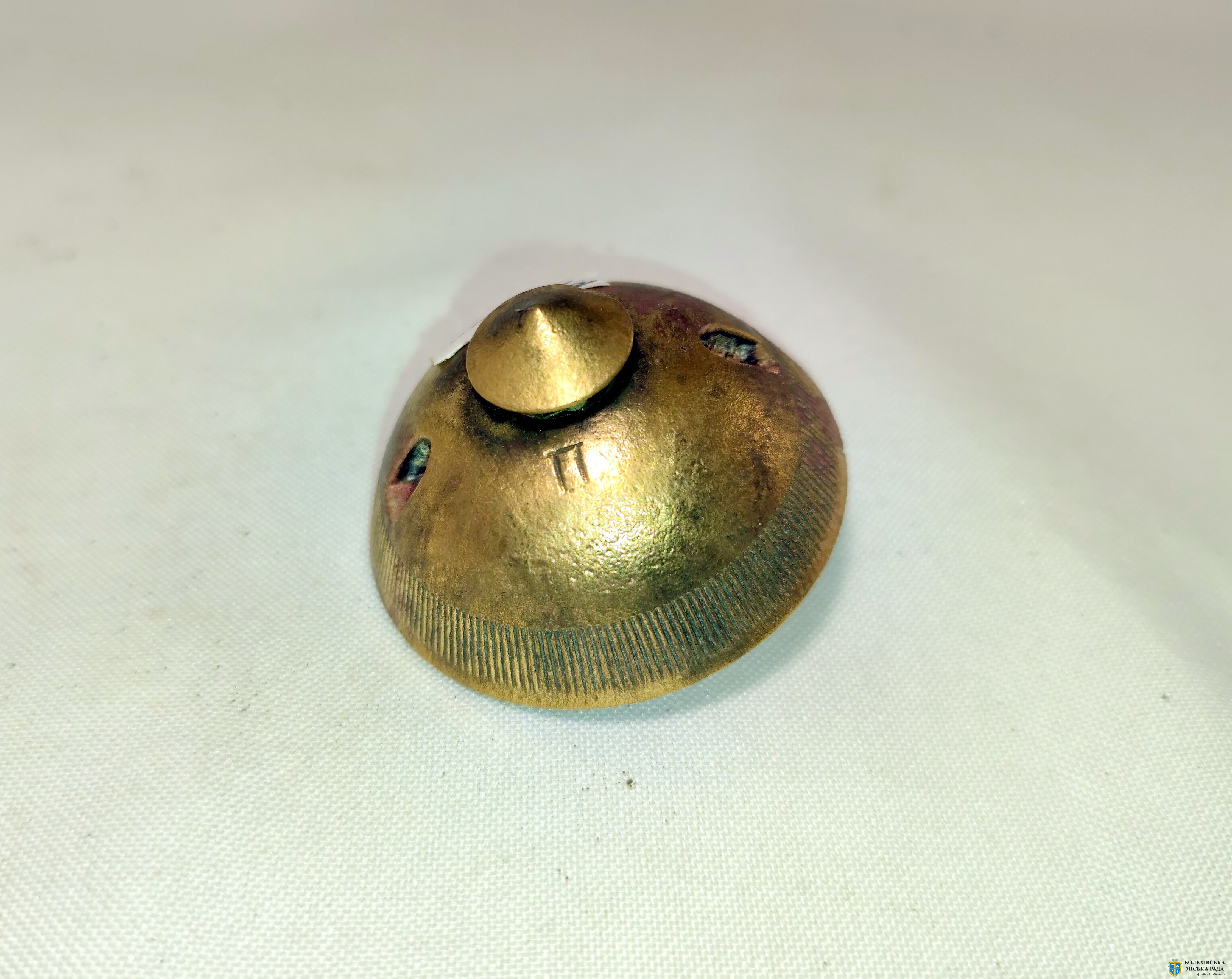 32 | Латунна головка снаряду 210 мм. Джерело: Краєзнавчий музей «Патріот», с. Тисів Болехівської міської територіальної громади Калуського р-ну Івано-Франківської області. Кн–193, А–193.7. Знайдено на Болехівській горі, м. Болехів). |