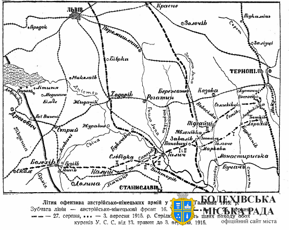 37 | Літня офензива союзних армій у Східній Галичині, 1915 рік. Джерело: Думін О. Історія Лєґіону Українських Січових Стрільців. 1914-1918. Львів, 1936. С. 131. Електронна бібліотека «Чтиво». URL: https://surl.li/wfmedh (дата доступу: 07.12.2025). |